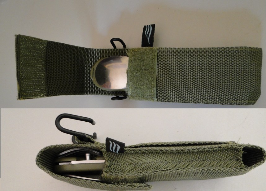Por fim, falemos da forma como ele é guardado. O conjunto vem muito bem guardado em um estojo de material resistente com um fecho de velcro. Possui também uma peça de metal para que seja fixado no cinto, idéia que não acho interessante, visto que você usará este equipamento apenas nas horas de refeições e quanto menos penduricalhos em seu corpo, mais confortável você fica.