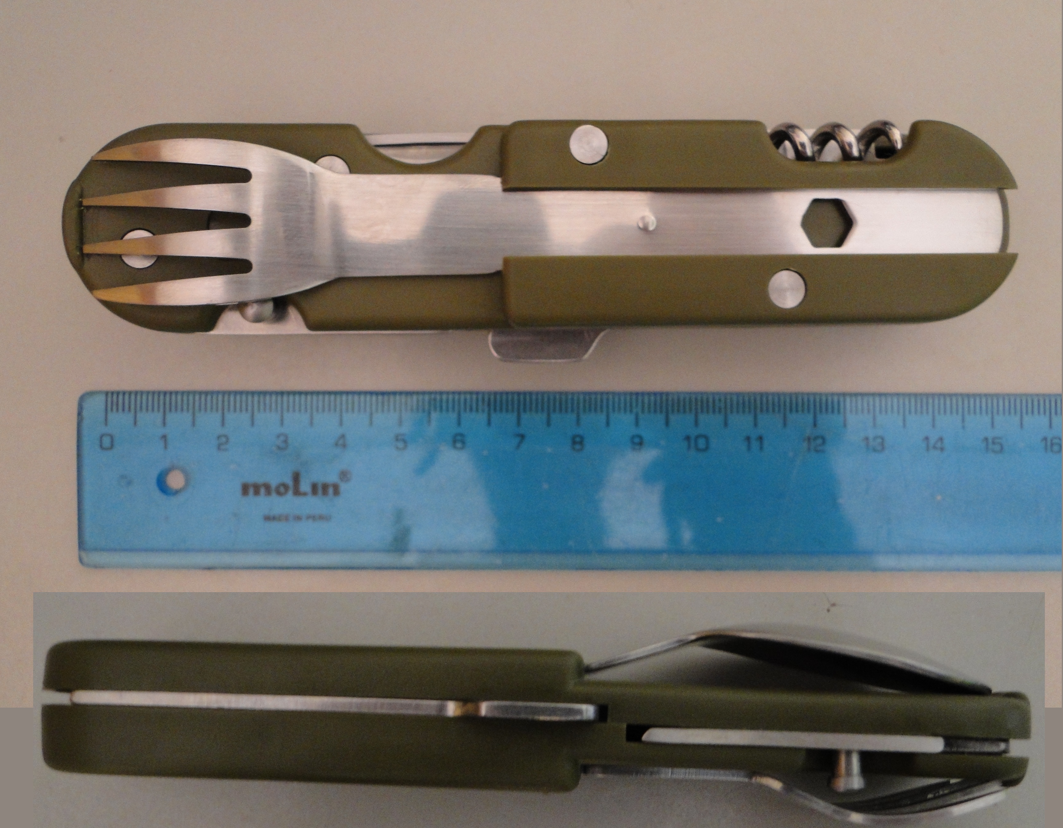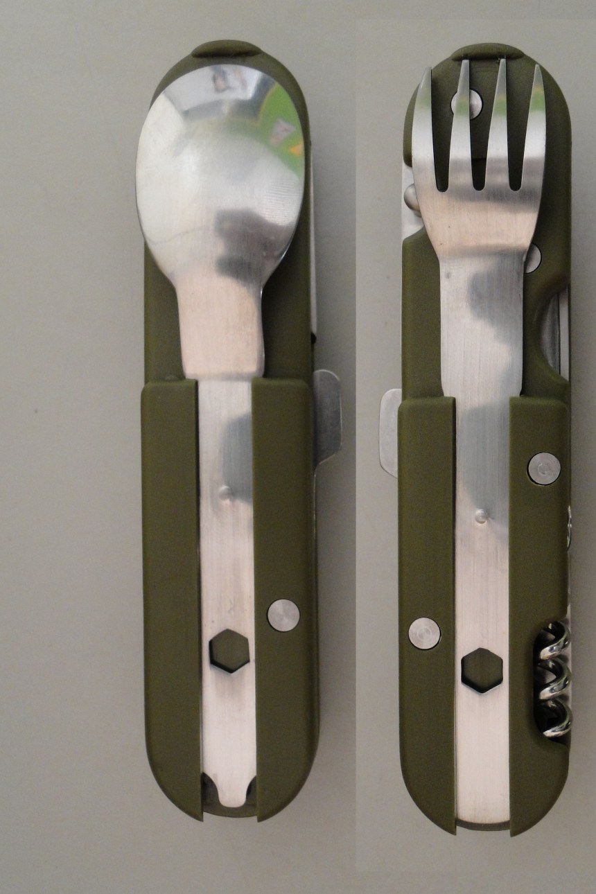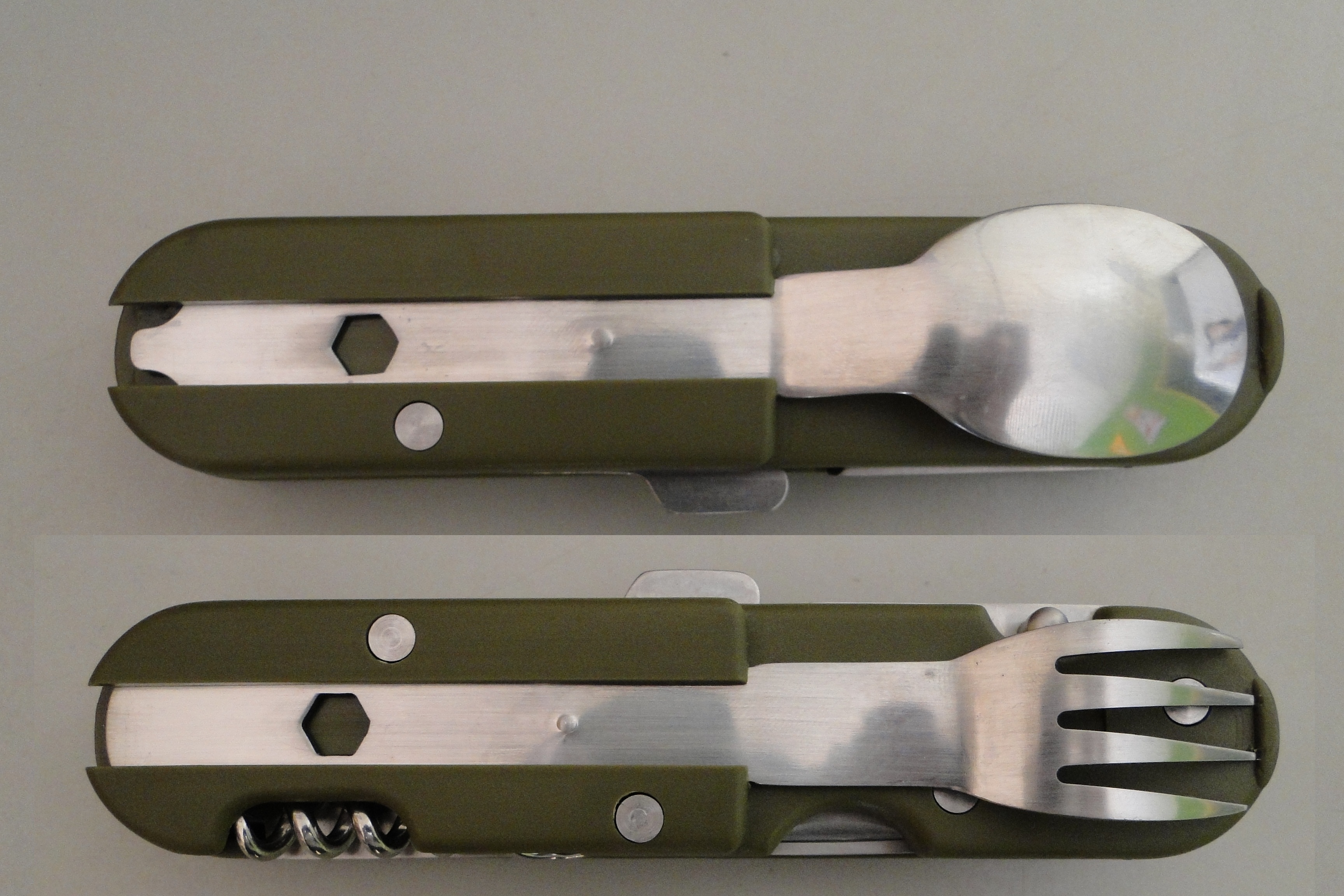 Este produto é encontrados em lojas de artigos para camping por cerca de 25 reais. Em sua estrutura você encontra uma colher, um garfo, uma faca, um saca rolhas e um abridor de lata.