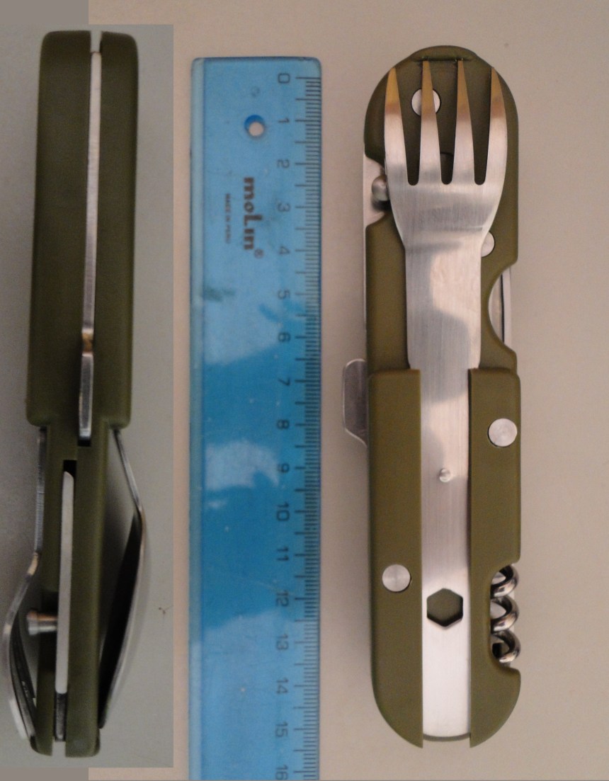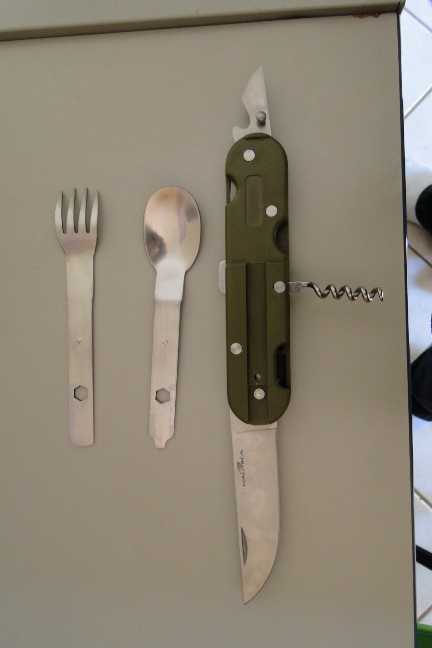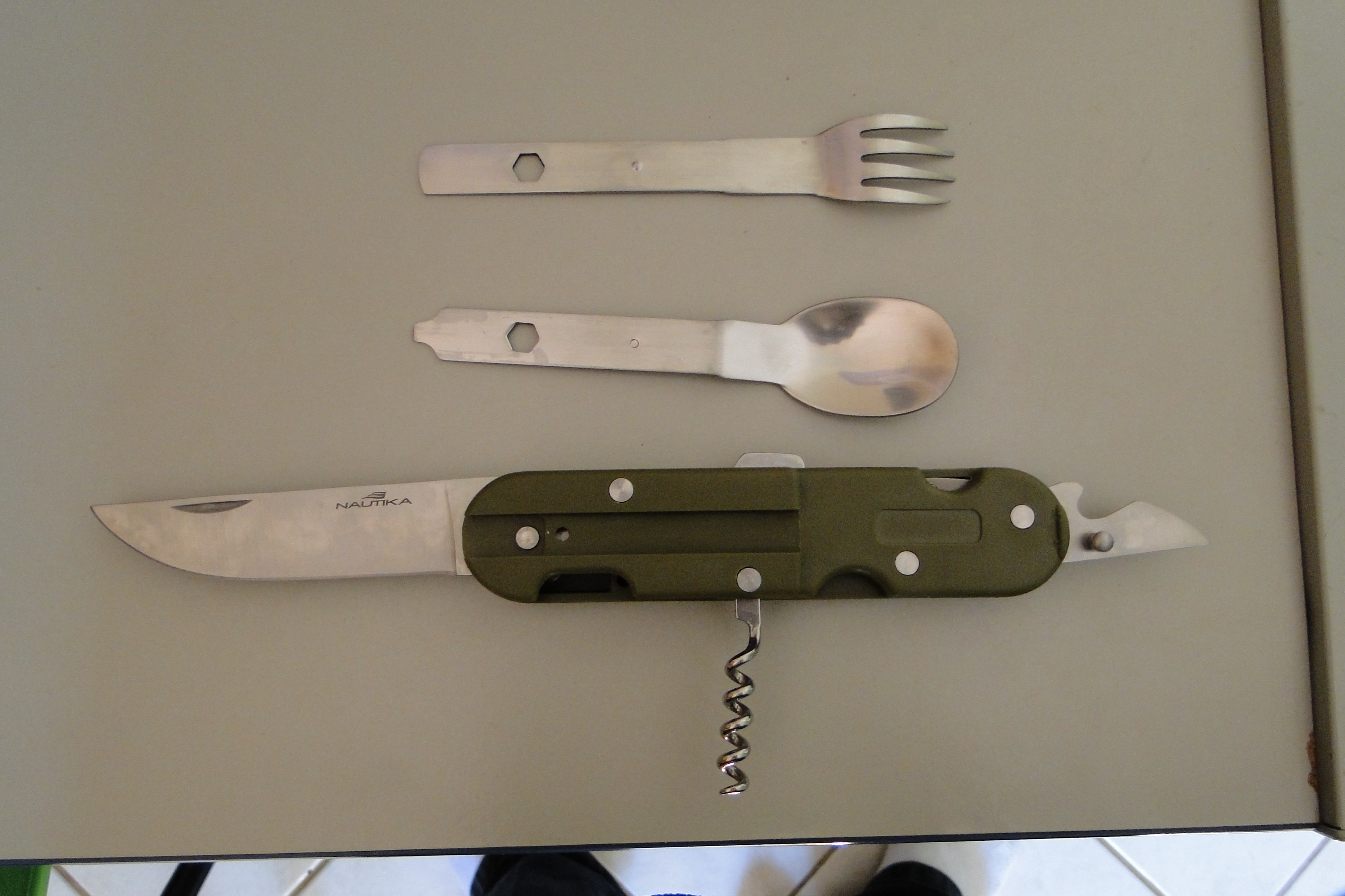 Este produto é encontrados em lojas de artigos para camping por cerca de 25 reais. Em sua estrutura você encontra uma colher, um garfo, uma faca, um saca rolhas e um abridor de lata.