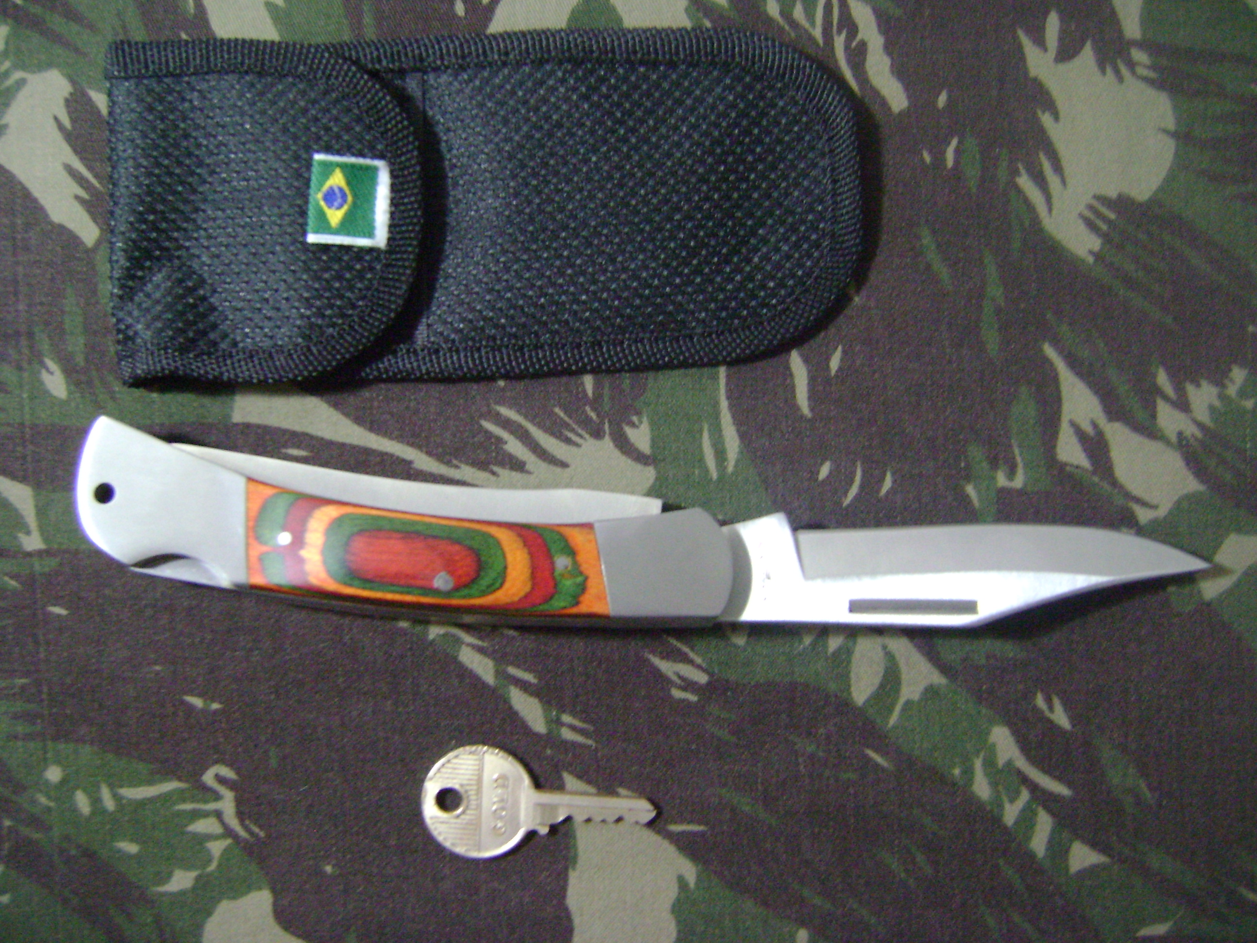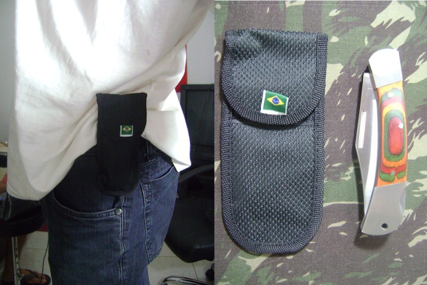 Ele já vem com bainha, que comporta o canivete de maneira segura e sem perigo de que esse caia durante algum movimento: