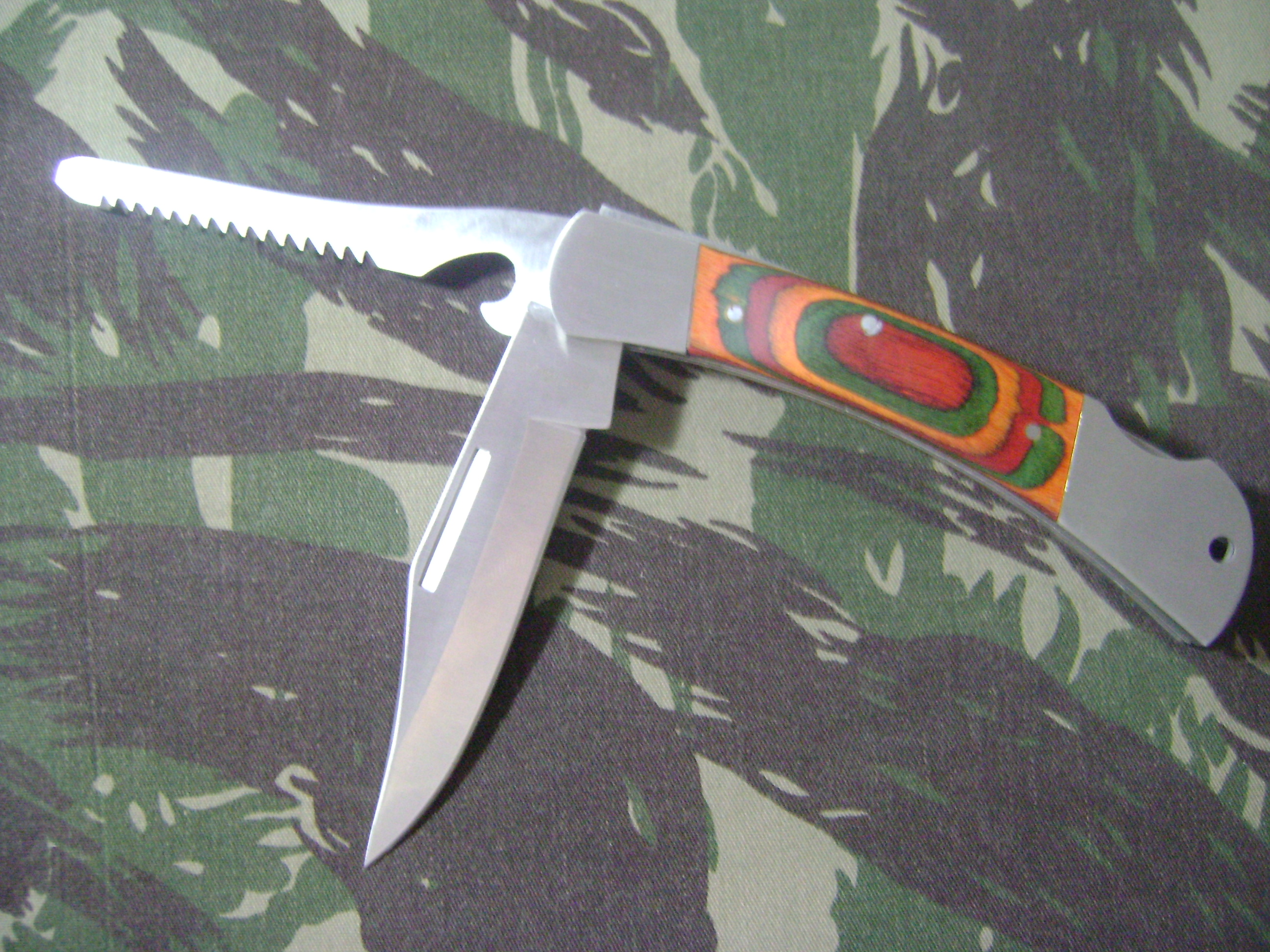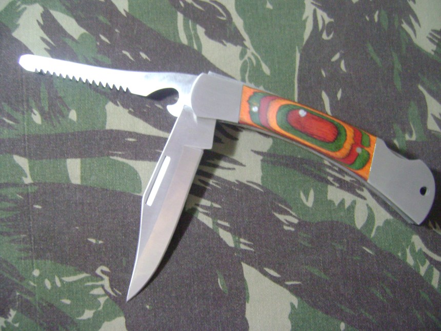 O canivete possui duas lâminas, uma como faca com fio e outra com uma serra. Nessa serra há também um abre latas e uma chave de fenda inclusos: