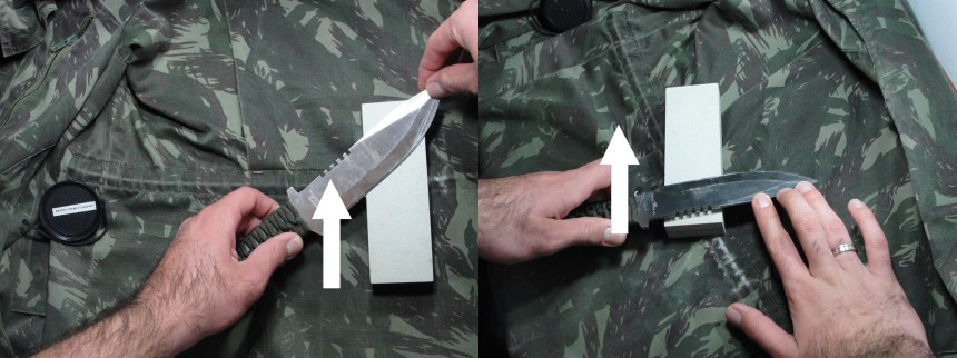 Para ambos dos métodos utilizados procure ao final finalizar esfregando a lâmina da faca em uma tira de couro ou uma lixa fina. Isso evita que o fio fique com a chamada barbinha, que é como se a lâmina estivesse serrilhada.