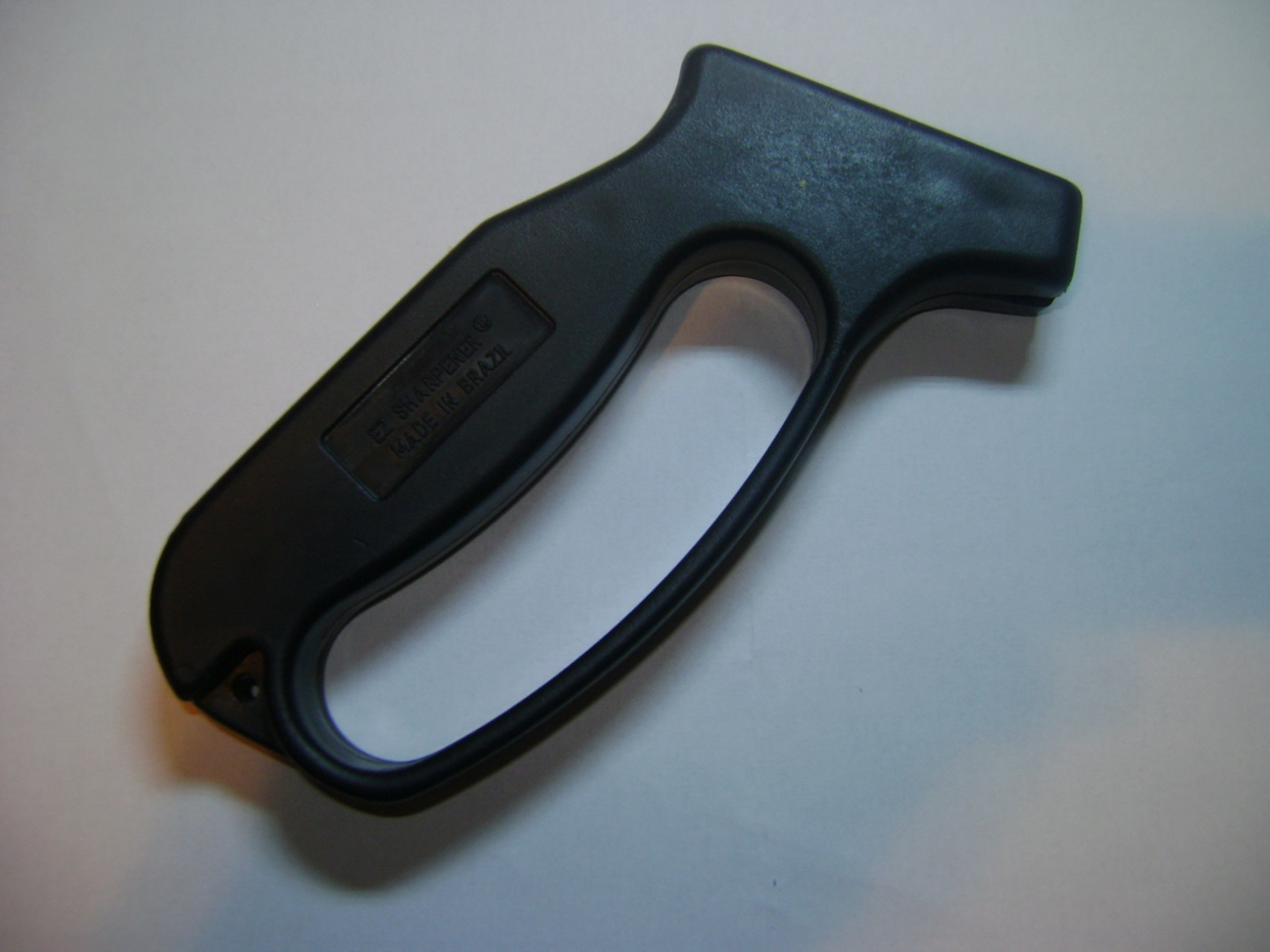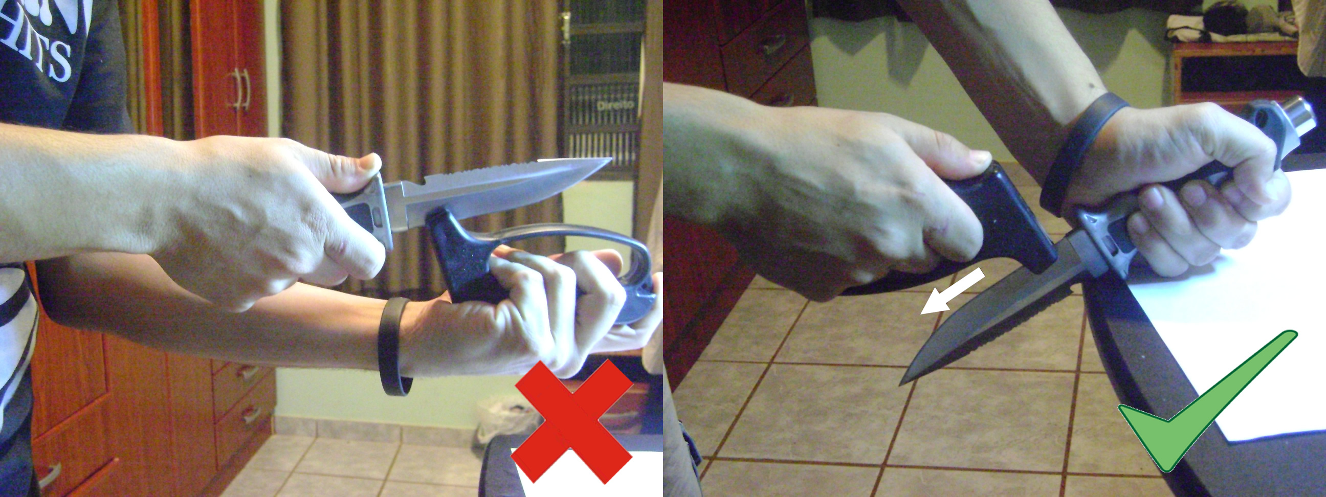 Repare que a faca fica parada e apoiada na borda da mesa enquanto você passa o afiador nele. O perigo desse aparelho é de você usar ao contrário, ou seja, passar a faca no afiador parado em sua mão. O vendedor que eu comprei esse aparelho me relatou um caso em que o usuário cortou todo o antebraço depois que a faca passou pelo afiador muito rápido e saiu de seu controle. Então cuidado ao manusear sua faca.
