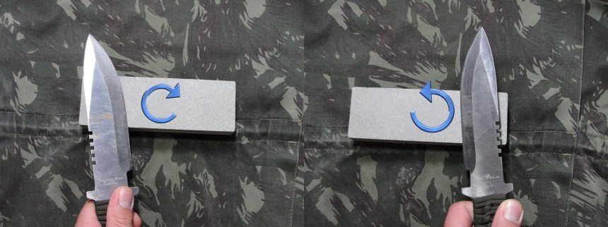 Agora vou mostrar um dos inúmeros métodos para afiar,  que eu e meus amigos usamos. Para começar, posicione a faca em um ângulo de 15 graus com pedra e faça movimentos circulares passando todo fio por toda a pedra. Repita essa operação nas duas faces da lâmina.