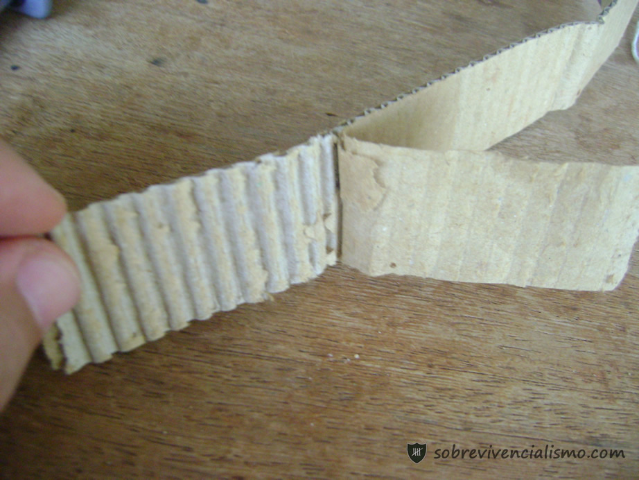 Corte a lata de massa de tomate, deixando a com cerca de 4,5 cm. Corte uma tira de papelão de 50 cm x 4,5 cm e retire um lado do papelão para que ele fique ondulado.