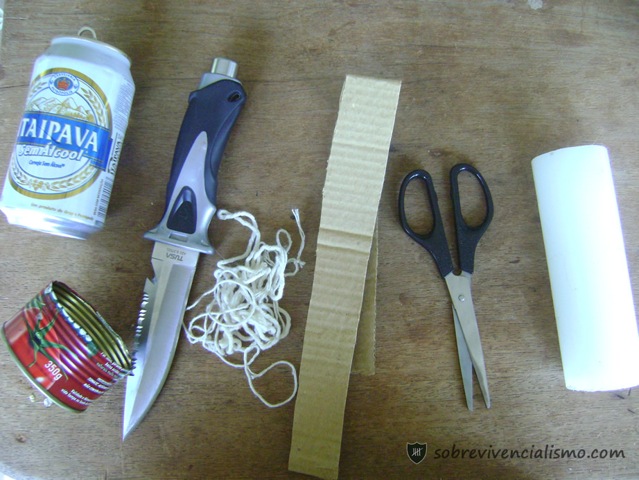 Você vai precisar de uma vela de 7 dias, uma lata de massa de tomate, uma faca, uma lata de cerveja ou refrigerante, barbante, uma caixa de papelão e tesoura.