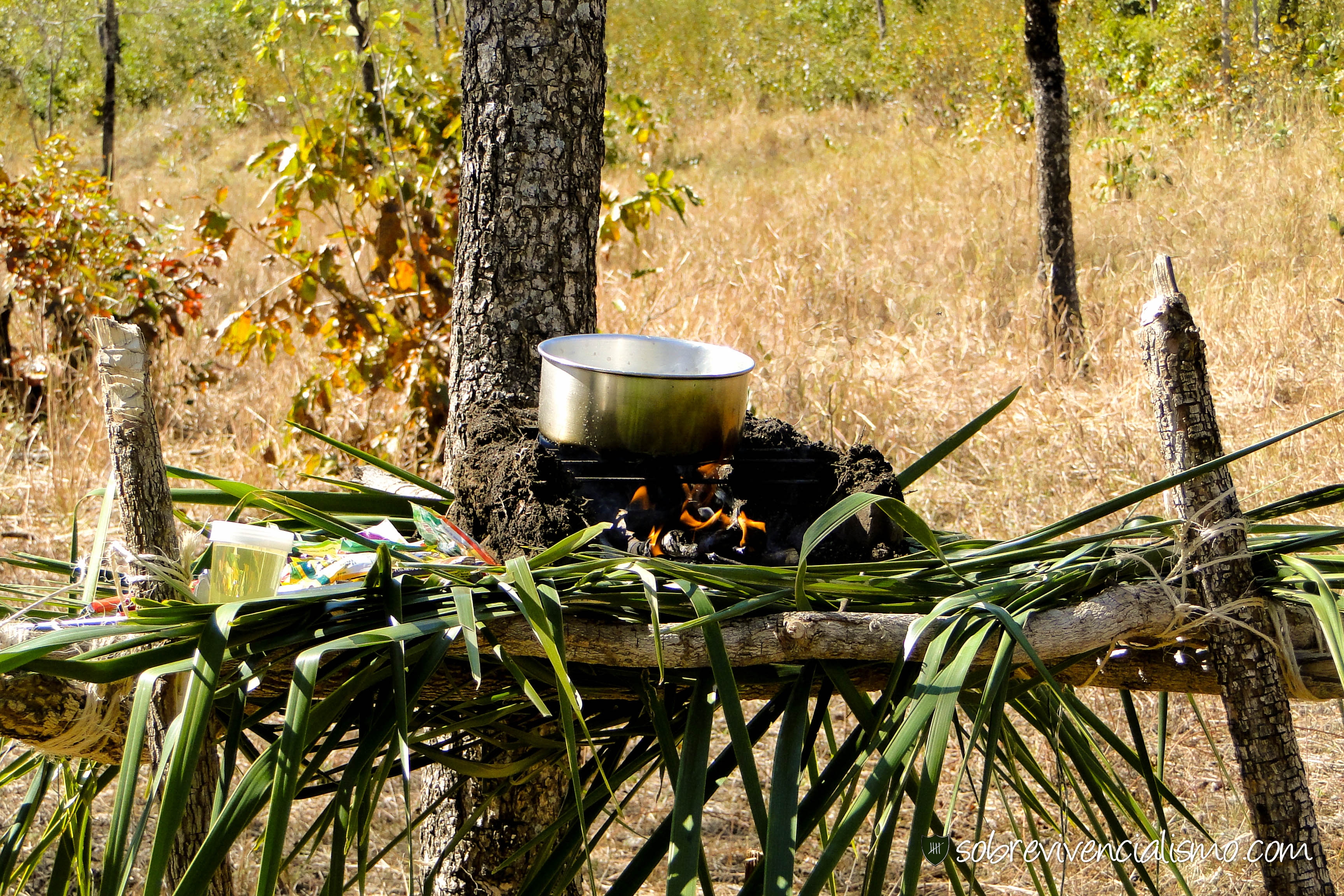 Querendo um pouco mais de conforto na hora de cozinhar elaboramos em um acampamento este fogão suspenso.
