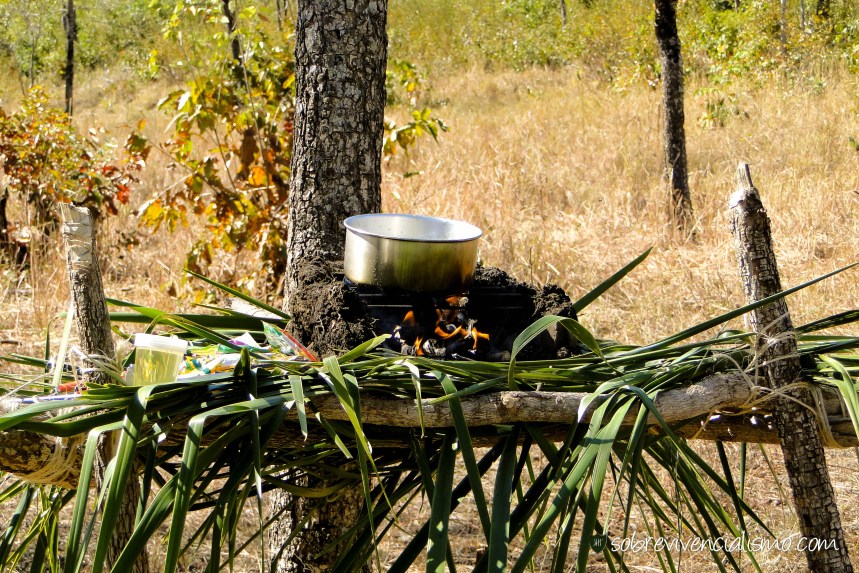 Para fazê-lo começamos montando um suporte de madeira recoberto por folhas de palmeira. O próximo passo foi adicionar uma cama de barro e pedras, montamos as paredes com muita terra, pedra e água. Após isso colocamos barras de ferro que funcionaram como grelhas e pronto!