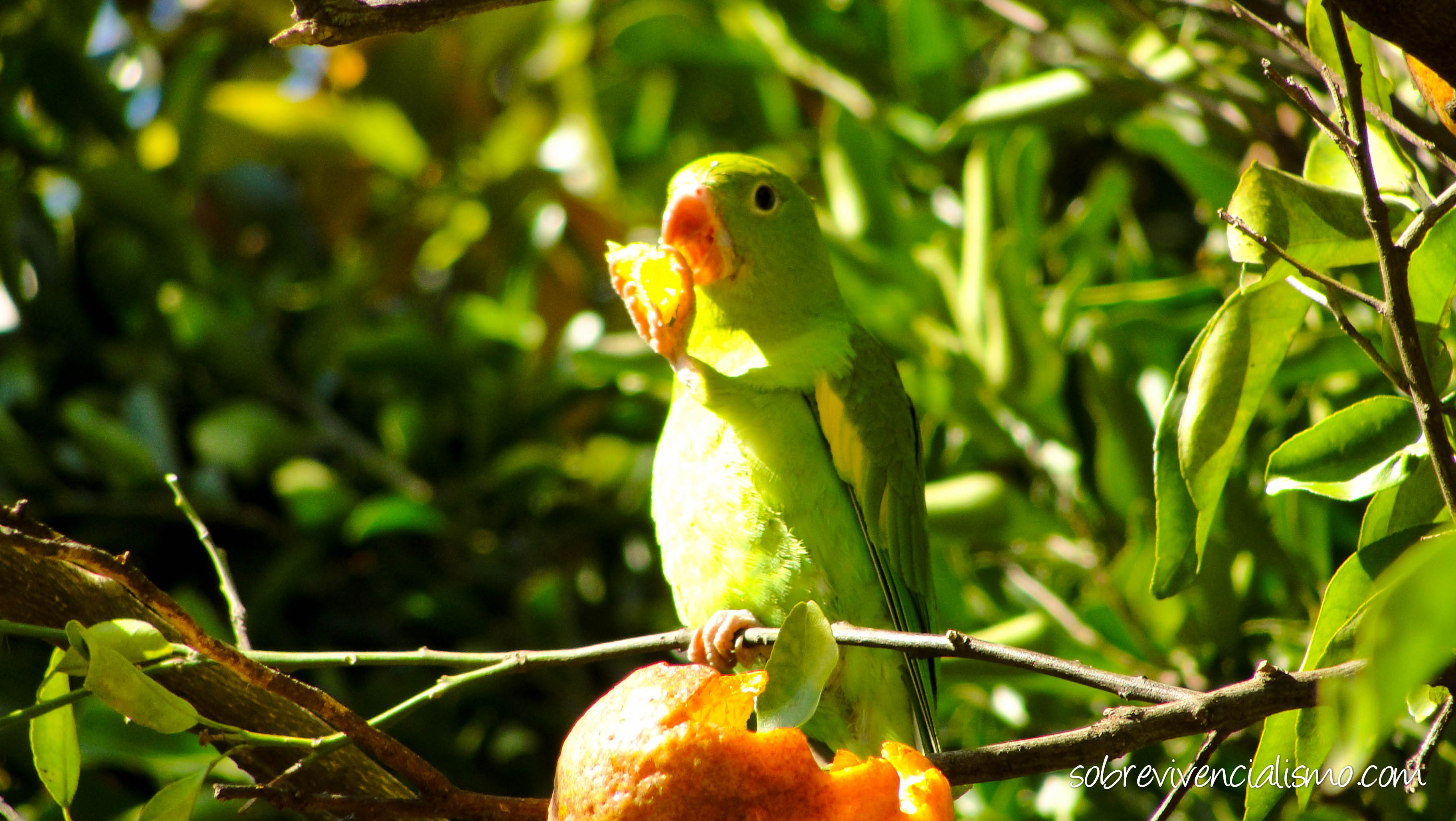 Papagaio matando a sua fome com uma suculenta tangerina.