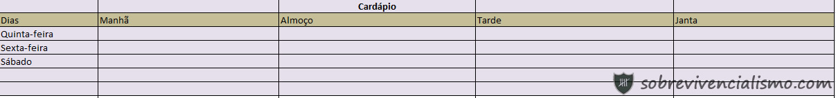Além dos equipamentos um bom aventureiro deve pensar na sua alimentação. Levar comida pode parecer fácil, porém requer um bom planejamento prévio para evitar que você leve excesso de peso em sua mochila e também evitar que você passe fome. Para isso faça uma tabela com os horários de todas as refeições diárias, os dias que irá durar sua aventura, e por fim complete com as refeições que desejar. Veja um exemplo abaixo: