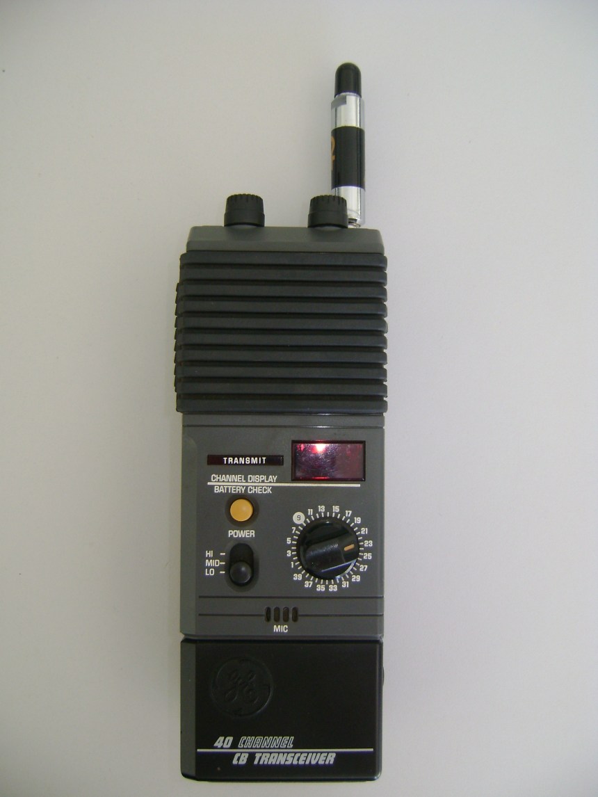 Pensando em portabilidade, tenho em meu kit um HT que opera na faixa do cidadão, com 40 canais em AM, de fabricação da GE. Fiz ainda uma pequena modificação inserindo na parte traseira um conector fêmea RCA para permitir a colocação de uma antena dipolo externa, para aumentar sua capacidade de recepção. Uma antena dipolo nada mais é que um pedação de cabo e fios, portanto leve e pouco volumosa. O inconveniente é que o aparelho, além de algo grande, opera com 8 pilhas AA, ou com fonte externa. Nas próximas postagens trataremos de formas alternativas de obtenção de energia.