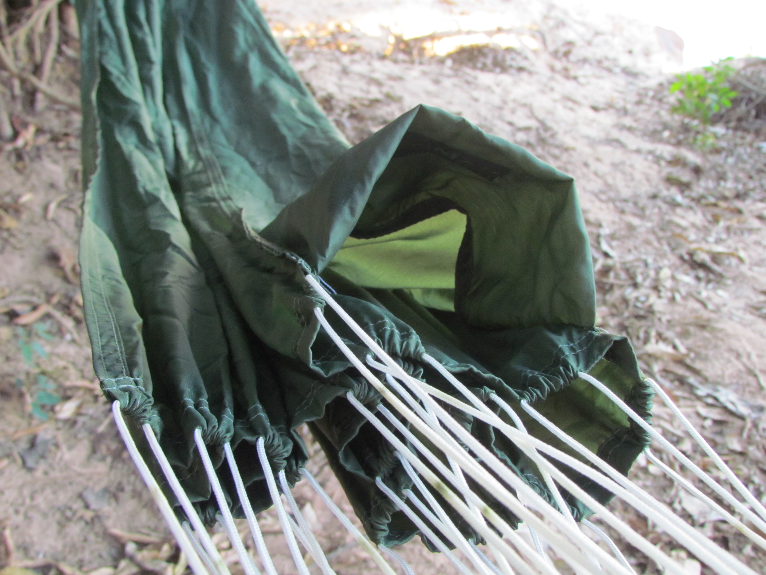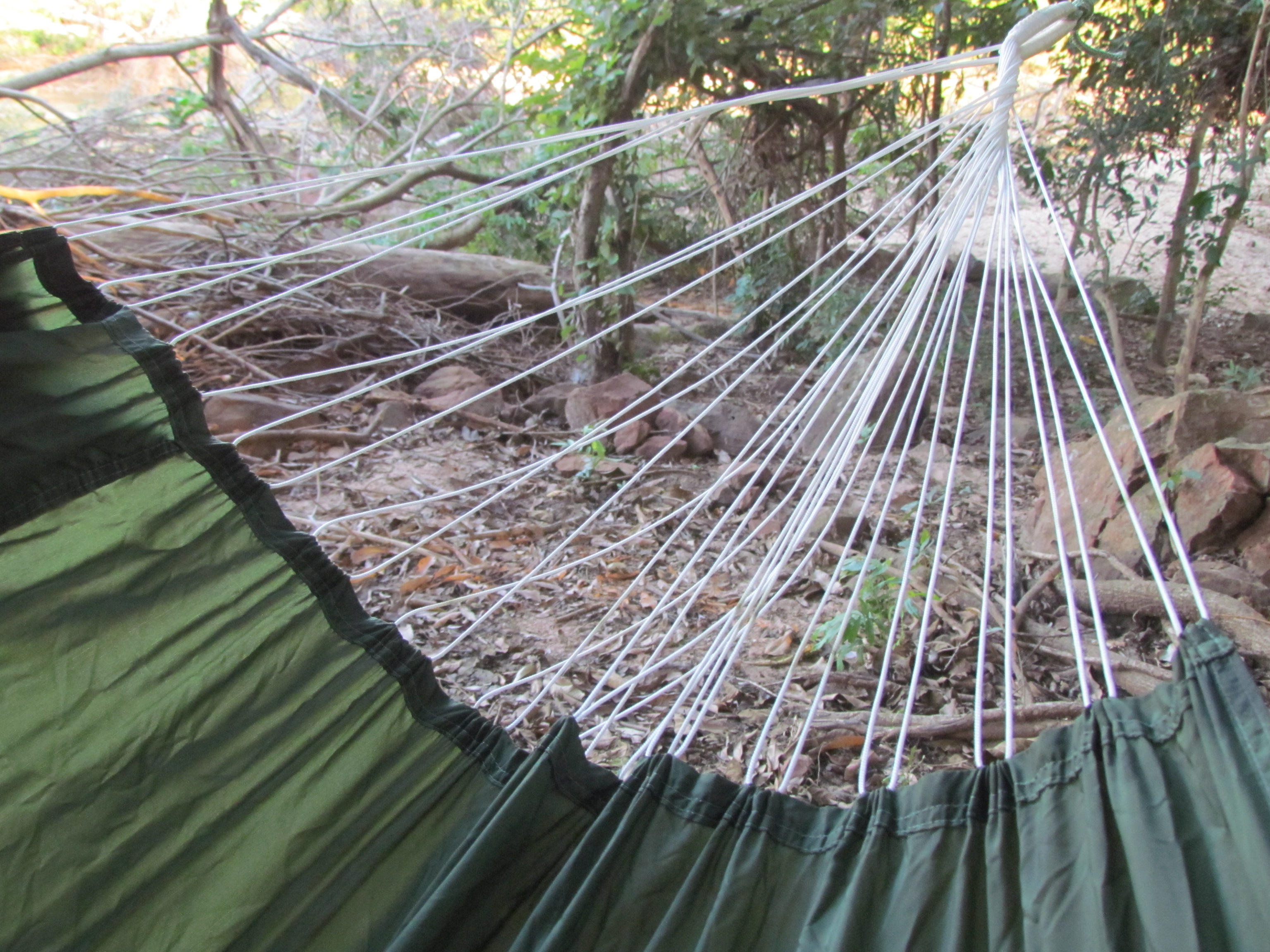 1- Quanto ao embaraçamento das cordas, se você não for precisar abrir totalmente a rede, aconselho deixar as cordas amarradas como vieram e prender uma corda extra (sempre devemos ter cordas em nosso equipamento, né?), bem amarrada, na extremidade do tecido ou numa alça formada pela própria corda da rede, usando esta extra para fixar na árvore. Se quiser, forme alças e use mosquetões pra torná-la mais prática!