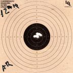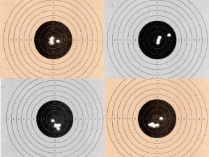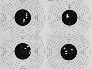 Para complementar, utilizaremos as fotos de agrupamentos feitas pelo usuário fp.honorato do fórum Airgun.com.br (veja aqui o post) para que vocês verifiquem a precisão dos agrupamentos (tiros repetidos no mesmo alvo visando obter a maior proximidade entre um disparo e outro) feitos pela carabina nas mais variadas distâncias.