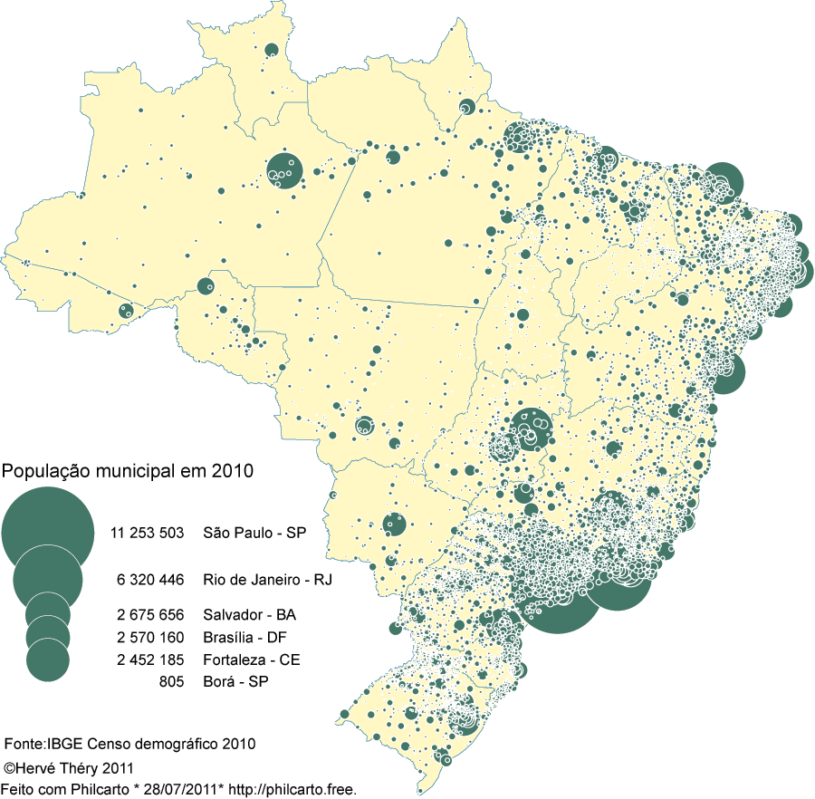 O último censo brasileiro aponta que grande parte da população está concentrada em pequenas áreas. Se você quer ter maior chance de sobreviver a uma catástrofe de grande abrangência, dê uma analisada com calma no mapa a seguir para ter uma referência visual de onde é preferível manter-se longe:
