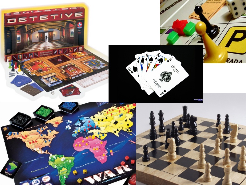 Alguns exemplos: Detetive, Banco imobiliário, War… Mas existem muitos outros e caso não tenha muito dinheiro para investir, com um baralho você pode jogar dezenas de jogos e você aprende sobre eles facilmente pela internet. Com papel e caneta também dá pra jogar muita coisa, liga pontos, jogo da velha, adedonha, jogo da forca… Existem muitos jogos simples, divertidos e alguns não dependem de nenhum material, como os jogos de adivinhação, mímica, entre outros.