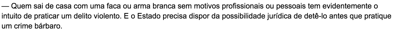 Claro que há um ponto positivo, não vou ser injusto aqui. Hoje quando a polícia para um “mano” e o vê com uma faca, não tem meios jurídicos para puni-lo, e sim, neste ponto, é um projeto interessante. Contudo, precisa ser aprimorado para não gerar restrições para as pessoas de bem e dar margem para interpretações erradas.