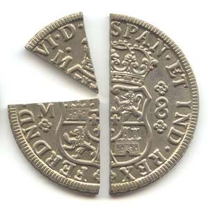 Uma das moedas que ganharam muita força nos séculos 16 e 17 em toda a Europa foi o real espanhol. Também foi chamado de “peça de oito” ou “dólares de prata”. Como uma dessas moedas valia 8 reais, muitas vezes era cortada em 8 peças parecidas com estas: