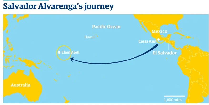Salvador Alvarenga, um pescador de 36 anos de El Salvador, deixou a costa do México em um pequeno barco com um jovem companheiro de tripulação 14 meses antes. Agora ele estava sendo levado para o Atol de Ebon, a ponta mais ao sul das Ilhas Marshall, e a cidade mais próxima de onde ele havia desembarcado. Ele estava a 10.700 km do lugar de onde partiu. Ele havia vagado por 438 dias.