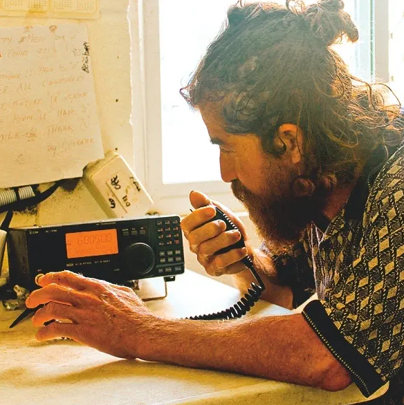 Fazendo contato por rádio após pousar no Atol de Ebon. Fotografia: Ola Fjeldstad.