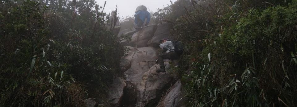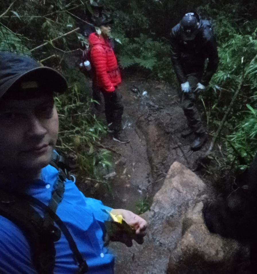 Após jantarmos, fomos para nossas barracas, onde passamos a noite. No dia seguinte, acordamos às 4h e começamos a trilha às 5h, apesar do escuro e da garoa constante. Cerca de uma hora depois, encontramos várias pessoas voltando, desistindo da caminhada.