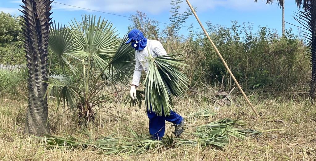 A escolha do bambu não é à toa: além de ser abundante e de crescimento rápido na região, ele oferece a combinação ideal de leveza e flexibilidade, permitindo ao tirador alcançar as folhas mais altas, que podem estar a mais de 10 metros do chão. Segurando a vara com firmeza e guiando a foice com movimentos calculados, o tirador vai retirando todas as folhas da carnaubeira, uma a uma, fazendo um aproveitamento completo da palha disponível. Ao contrário de sistemas que deixam parte das folhas na árvore, aqui a colheita é total, garantindo que nenhuma parte da planta que possa ser aproveitada fique para trás.